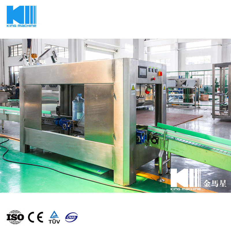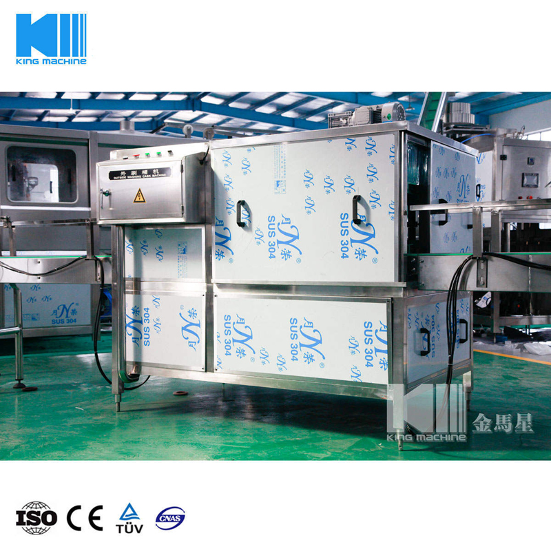 本灌裝生產(chǎn)線專用于3-5加侖桶裝水的灌裝,型號包括了QGF-100,QGF-240,QGF-300,QGF-450,QGF-600,QGF-900,QGF-1200。合消毒、沖洗、灌裝、壓蓋四為一體。沖洗機采用了多種洗液以及消毒液對瓶子進行清洗以及消毒,消毒液能夠循環(huán)使用。瓶蓋會在清洗和消毒后運至旋蓋機自動進行旋蓋。本產(chǎn)品功能齊全,涵蓋了清洗、消毒、灌裝、旋蓋、計數(shù)等功能,高度自動化,實為飲料生產(chǎn)廠家理想的優(yōu)選設備。