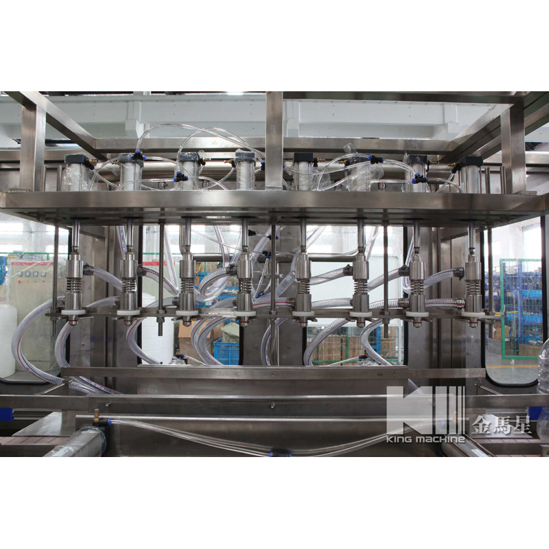 本灌裝生產(chǎn)線專用于3-5加侖桶裝水的灌裝,型號(hào)包括了QGF-100,QGF-240,QGF-300,QGF-450,QGF-600,QGF-900,QGF-1200。合消毒、沖洗、灌裝、壓蓋四為一體。沖洗機(jī)采用了多種洗液以及消毒液對(duì)瓶子進(jìn)行清洗以及消毒,消毒液能夠循環(huán)使用。瓶蓋會(huì)在清洗和消毒后運(yùn)至旋蓋機(jī)自動(dòng)進(jìn)行旋蓋。本產(chǎn)品功能齊全,涵蓋了清洗、消毒、灌裝、旋蓋、計(jì)數(shù)等功能,高度自動(dòng)化,實(shí)為飲料生產(chǎn)廠家理想的優(yōu)選設(shè)備。